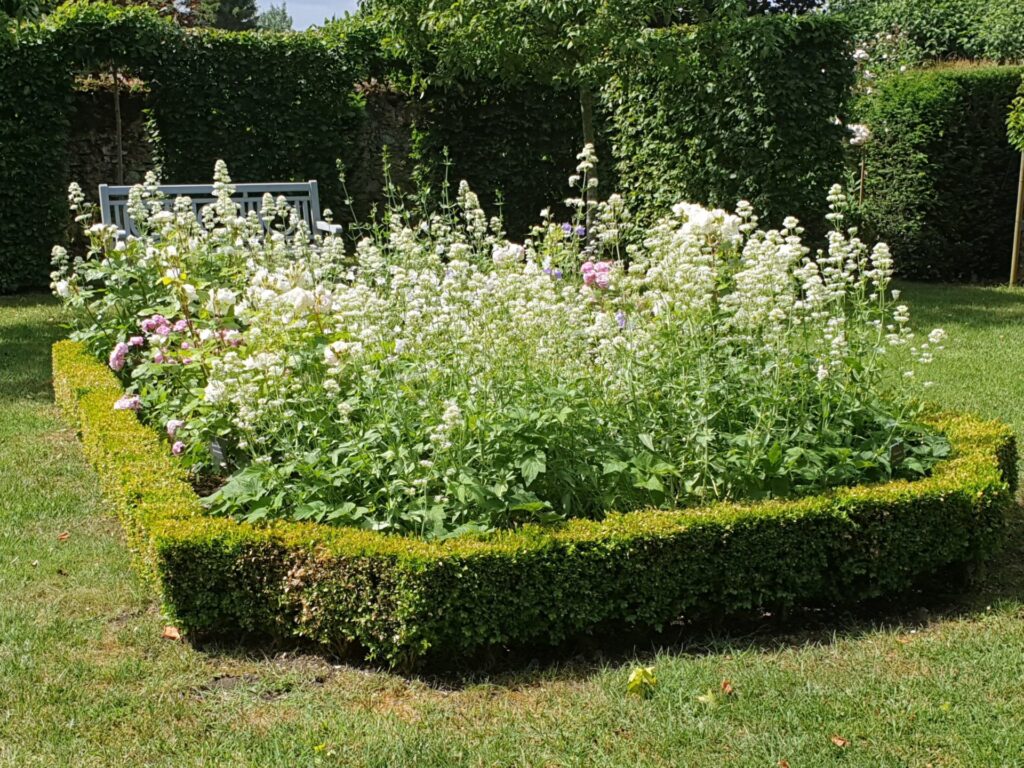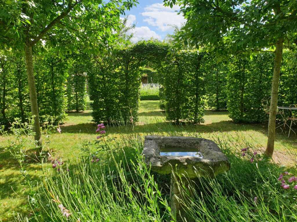 A l’arrière le jardin est divisé en quatre grandes chambres délimitées par des haies de charmilles de hauteurs différentes. Ces chambres, du repos, de l’esprit etc, sont ponctuées d’ouvertures pour créer des perspectives et comprennent parterres de buis boules, pommiers d’ornements (malus), parterres de vivaces à fleurs blanches (anémones, rosiers), parterres de vivaces à fleurs mauves, nombreux rosiers modernes et anciens, buissons et grimpants (blancs et roses), rangée de tilleuls, bancs de repos. Un chemin de ronde fait le tour du jardin clos par des murs en pierre, lesquels sont cadencés par des ifs taillés en contreforts.