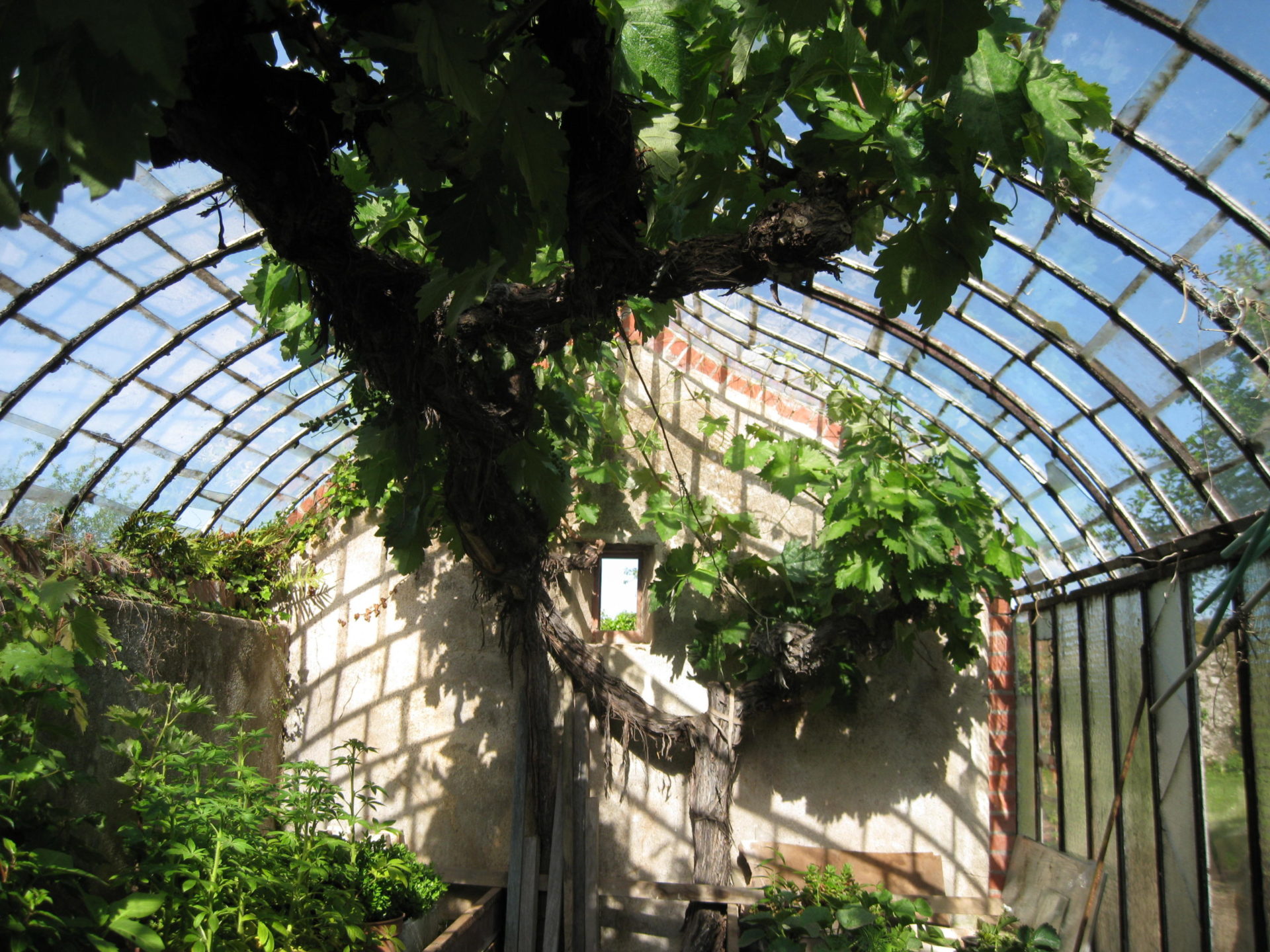 L’allée principale du jardin potager longe de jolis parterres abondamment fleuris tout au long de l’année. Ils sont bordés de buis et décorés de poiriers taillés en quenouille. Les autres allées desservent les 8 grands carrés de cultures où s’entremêlent légumes et fleurs annuelles. Une belle serre, à la voûte en forme de bateau renversé, elle aussi datée de 1839, donne tout son charme au potager. Elle contient un très vieux pied de vigne, dit « de Jérusalem ». Elle est utilisée quotidiennement pour les semis et boutures. Tout près d’elle, le verger déploie ses haies fruitières, certaines âgées de plus de cent ans, taillées en palmettes.