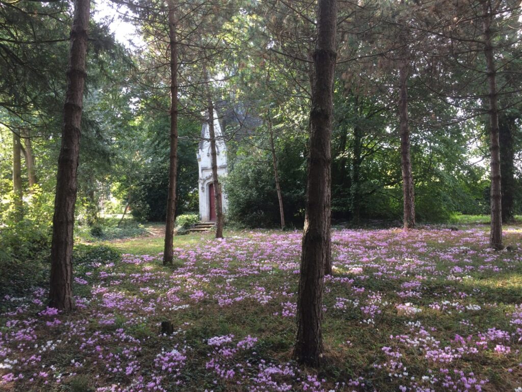 Dans le parc, le promeneur emprunte à son gré les allées aux allures romantiques, aux courbes amples bordées de buissons délimitant les bosquets et les axes de vues. Des percées permettent de deviner la vallée de la Loire. Ce cadre enchanteur invite à la méditation et à l’observation de la nature. Quelques espèces intéressantes l’enjolivent : les cèdres du Liban, le bouquet d’ormes du Caucase (« Zelkova caprinifolia »), le Sophora japonica, le Sequoia taxodium sempervirens, etc…Au cours de la promenade, on remarquera par ailleurs, la belle chapelle de style « Plantagenet » et le kiosque en rocaille.