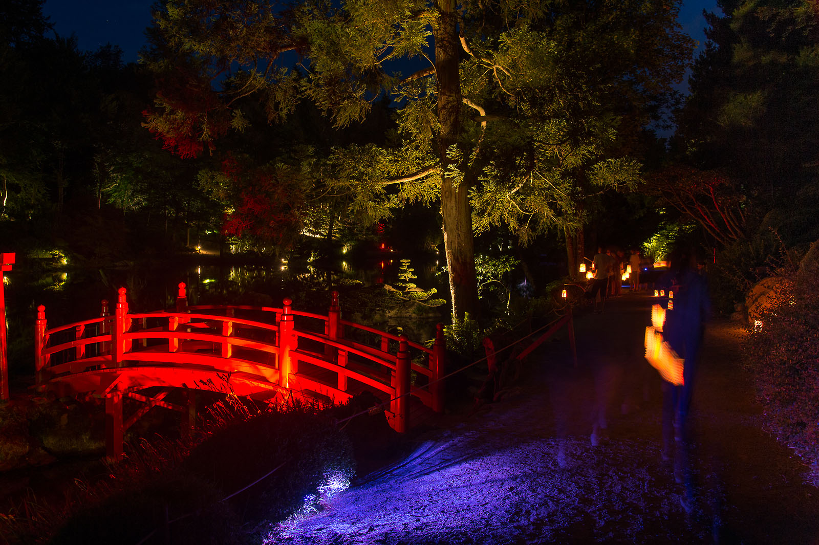 Après avoir découvert le parc le jour, dès la tombée de la nuit, vous pouvez vous promener autour de la pièce d’eau, entre pénombre et lumière, au rythme de contes japonais traditionnels pour petits et grands.